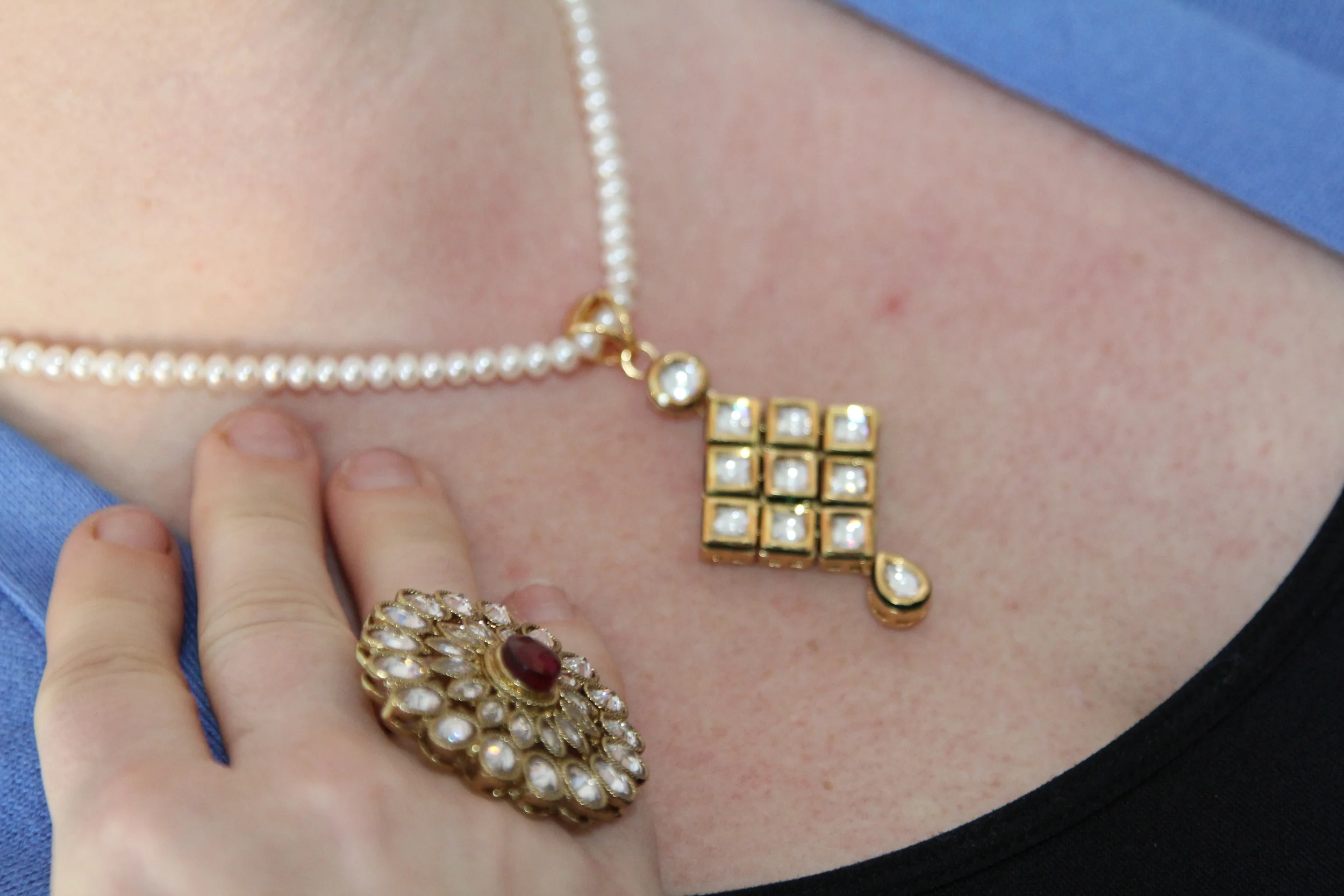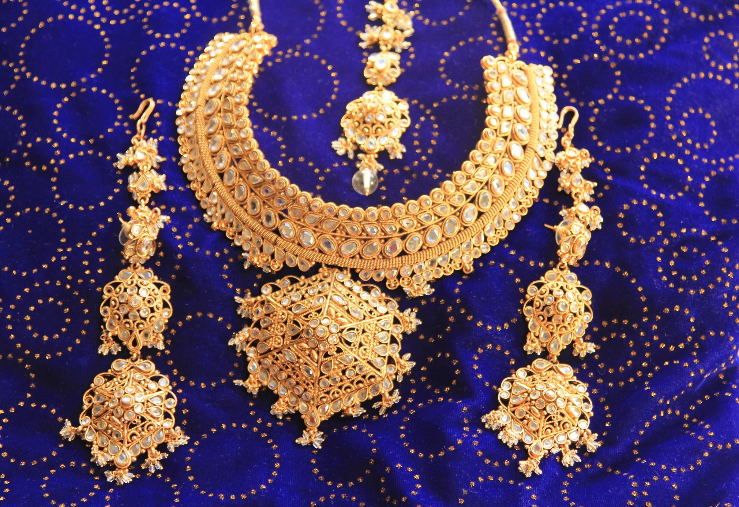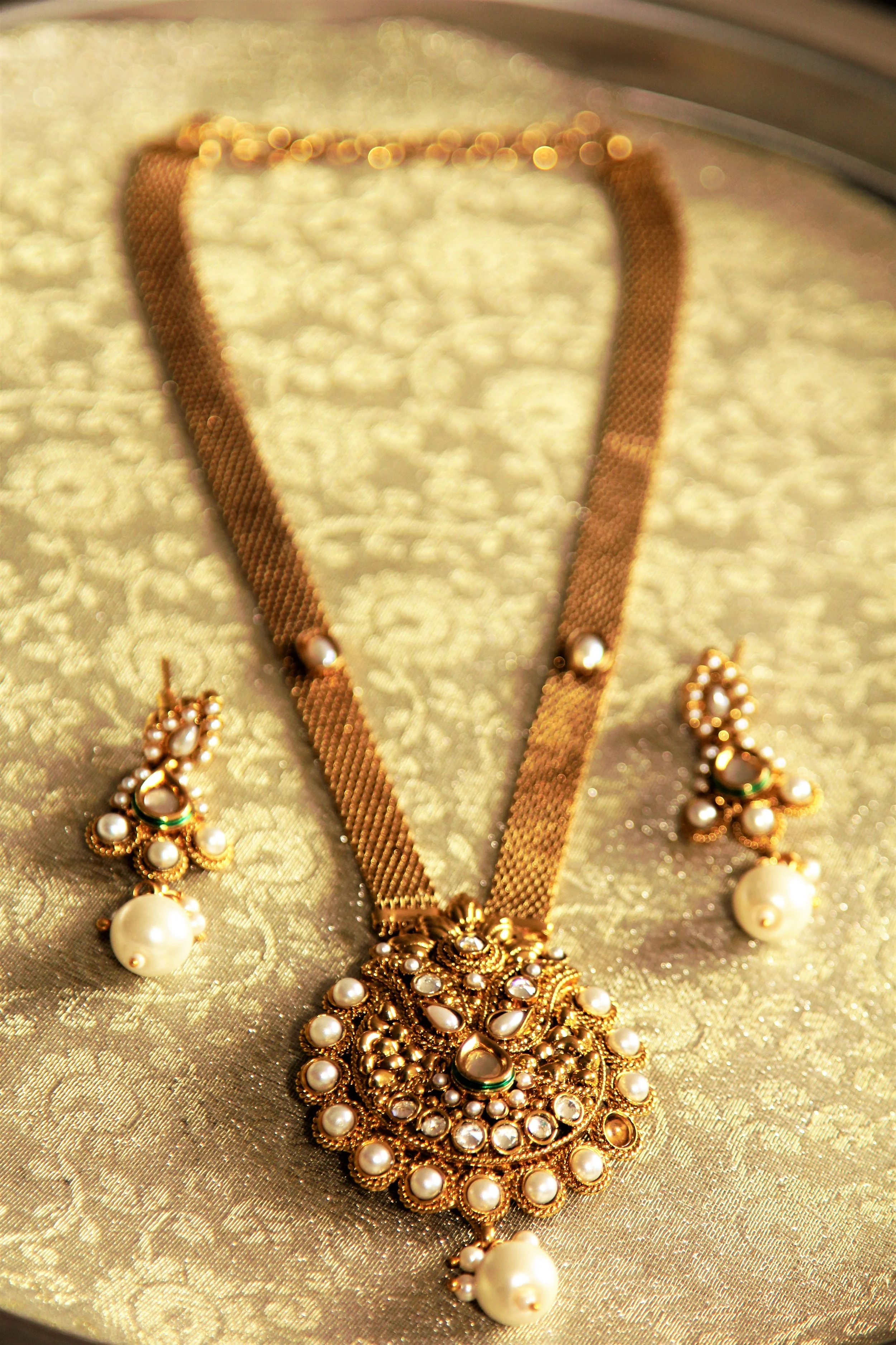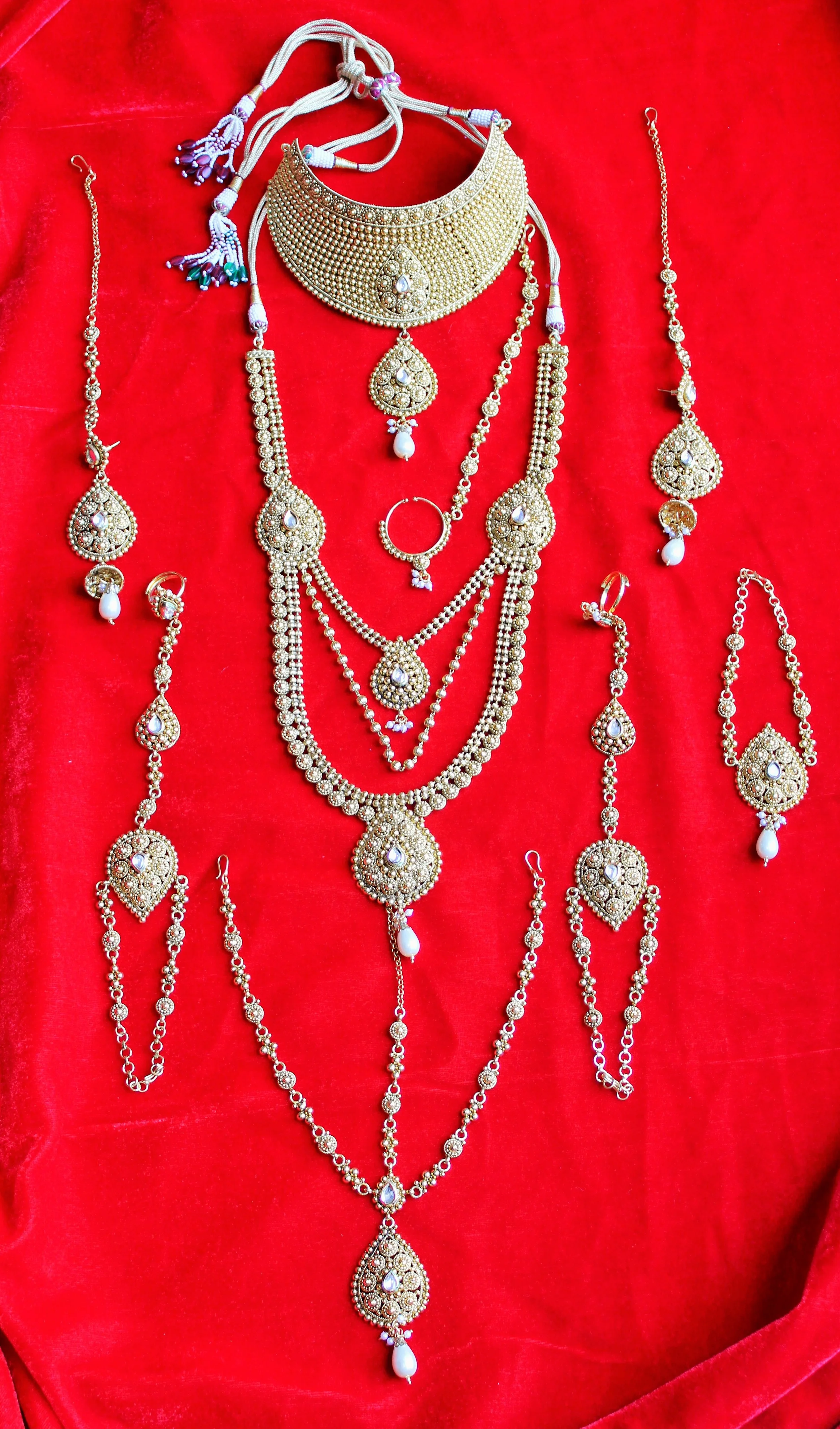 An intricate Choker Necklace made with polki uncut diamonds and finished with a pearl drop; paired with Long Drop Earrings; a long necklace Raani Haar (Queen's Necklace); a beautiful 3-strand Tikka Headpiece; a pair of Hand Harnesses; a traditional Armband; completed by a wicked Nose Ring. Funny story behind this - The quality and finish of our LAMYRA Jewellery is so impeccable that our summer collection was detained at the customs office as it was mistaken for real gold jewellery :) The agony I've felt trying to get this to you would beat.. well... even childbirth agony haahaa :)
