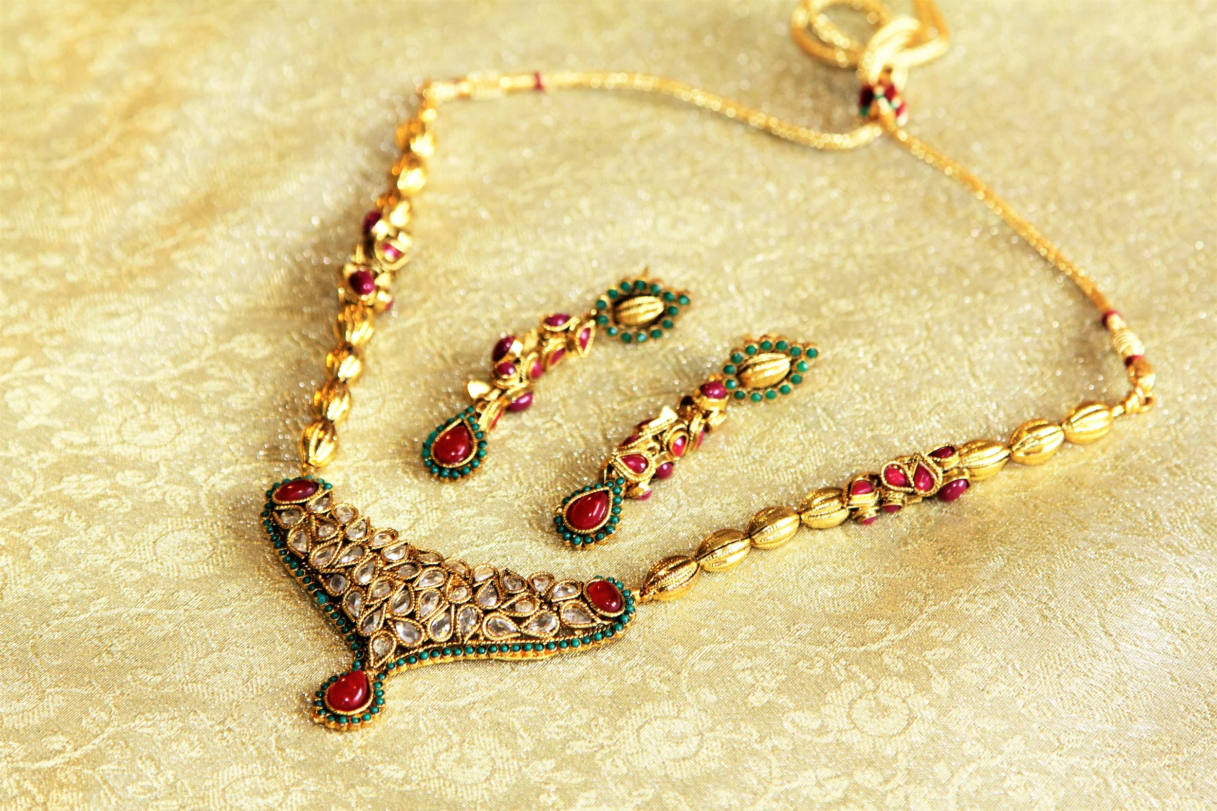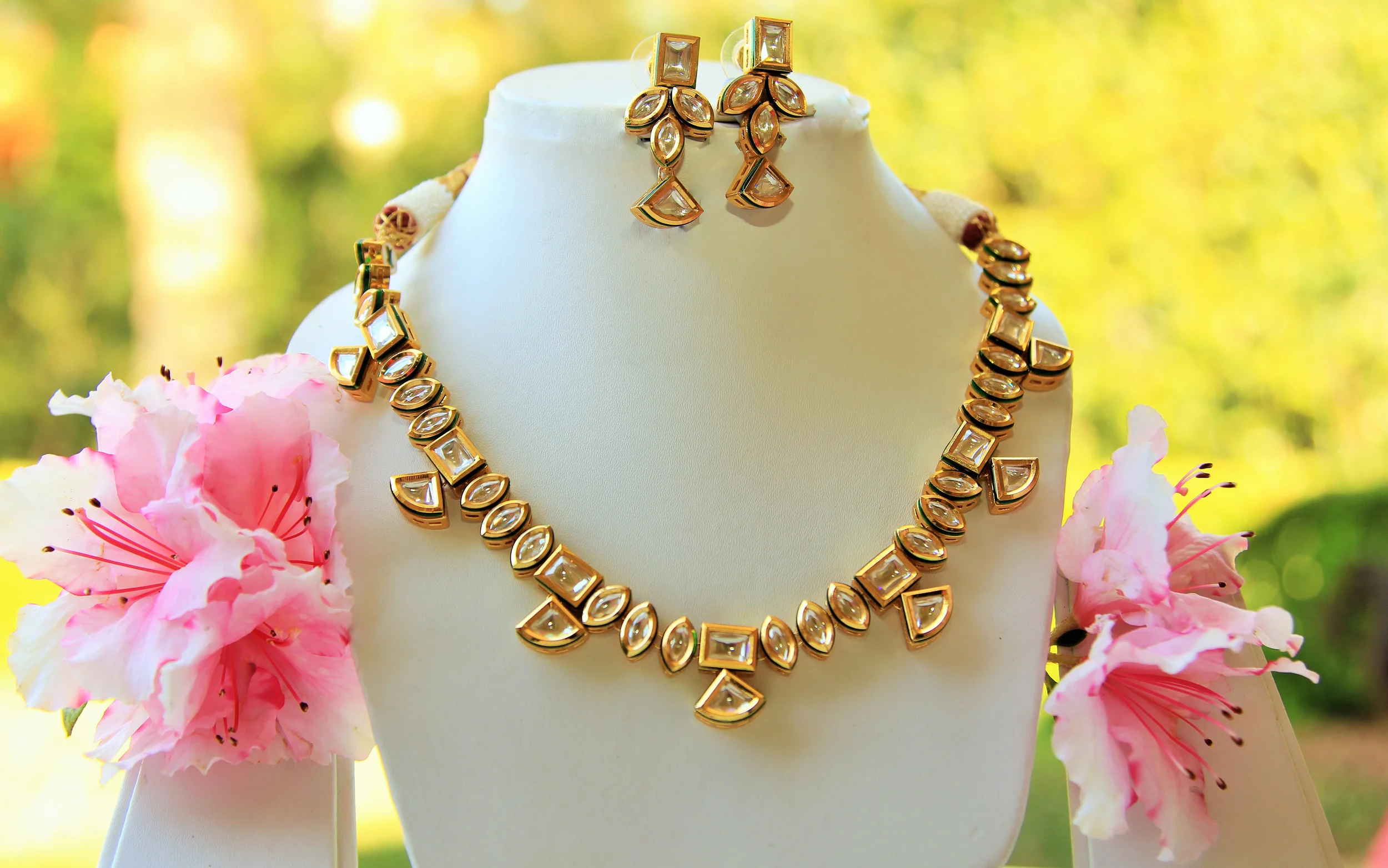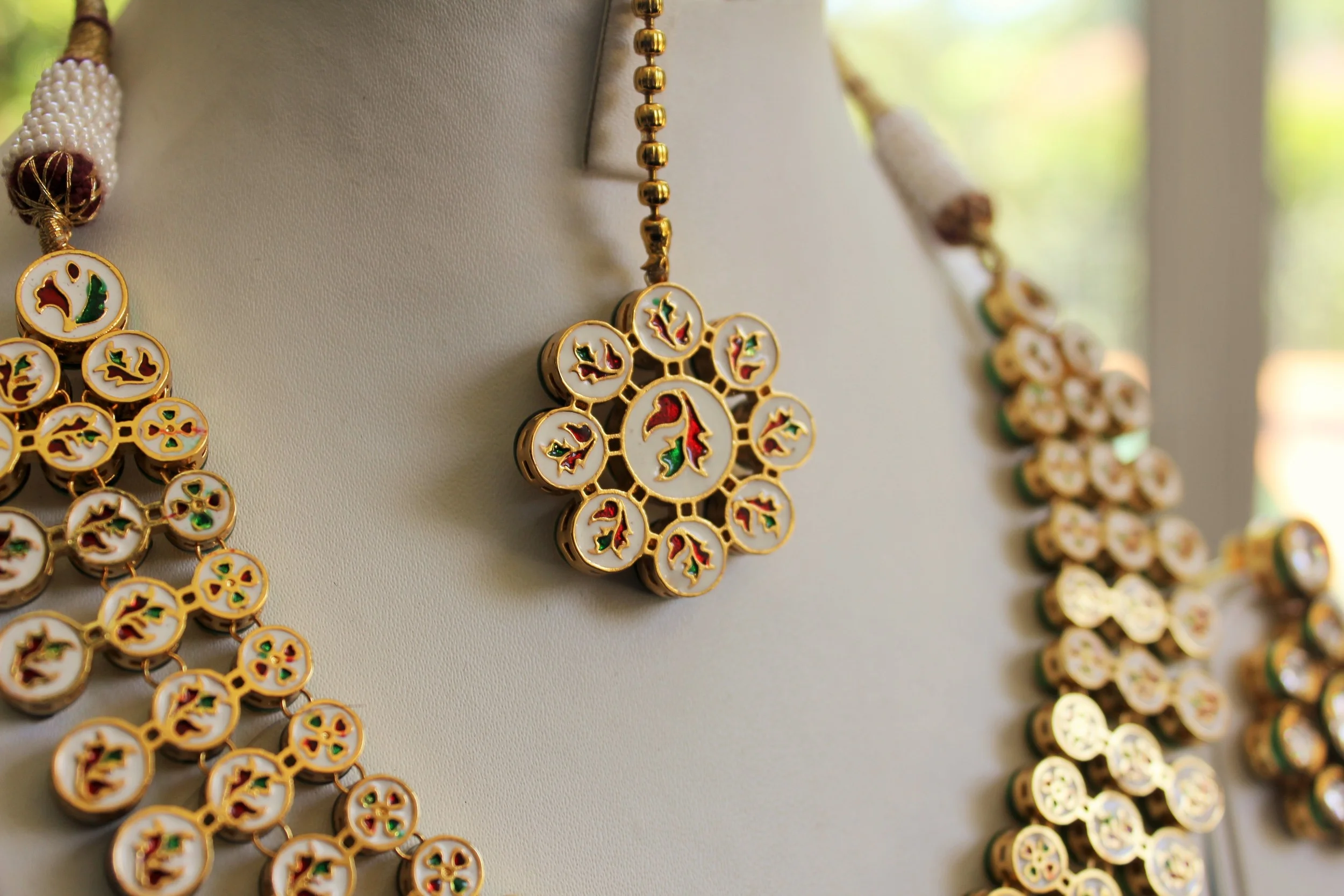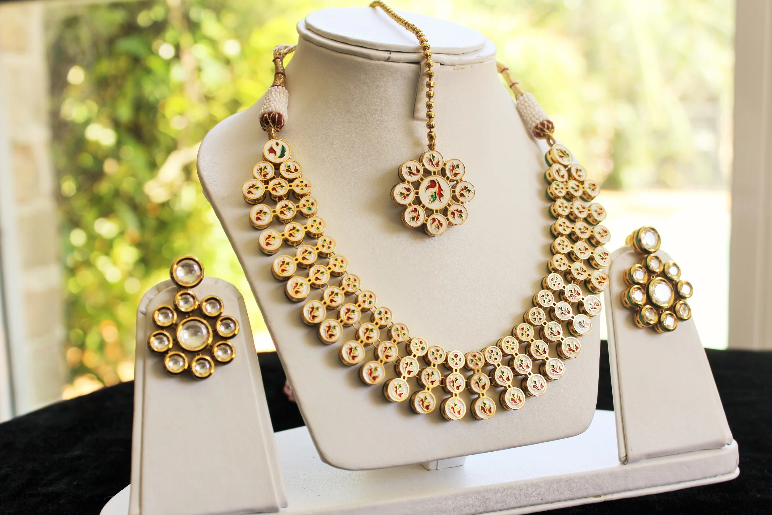 A 3-strand Polki Necklace, Flower Earrings and Flower Tikka Headpiece set that has intricate meenkari work on the other side - so you could wear the blingy polki side at your wedding and then flip it around to the gorgeously subtle meena side for your reception or to any other event. PS: only the necklace and headpiece can be turned around and worn 2-ways, not the earrings.