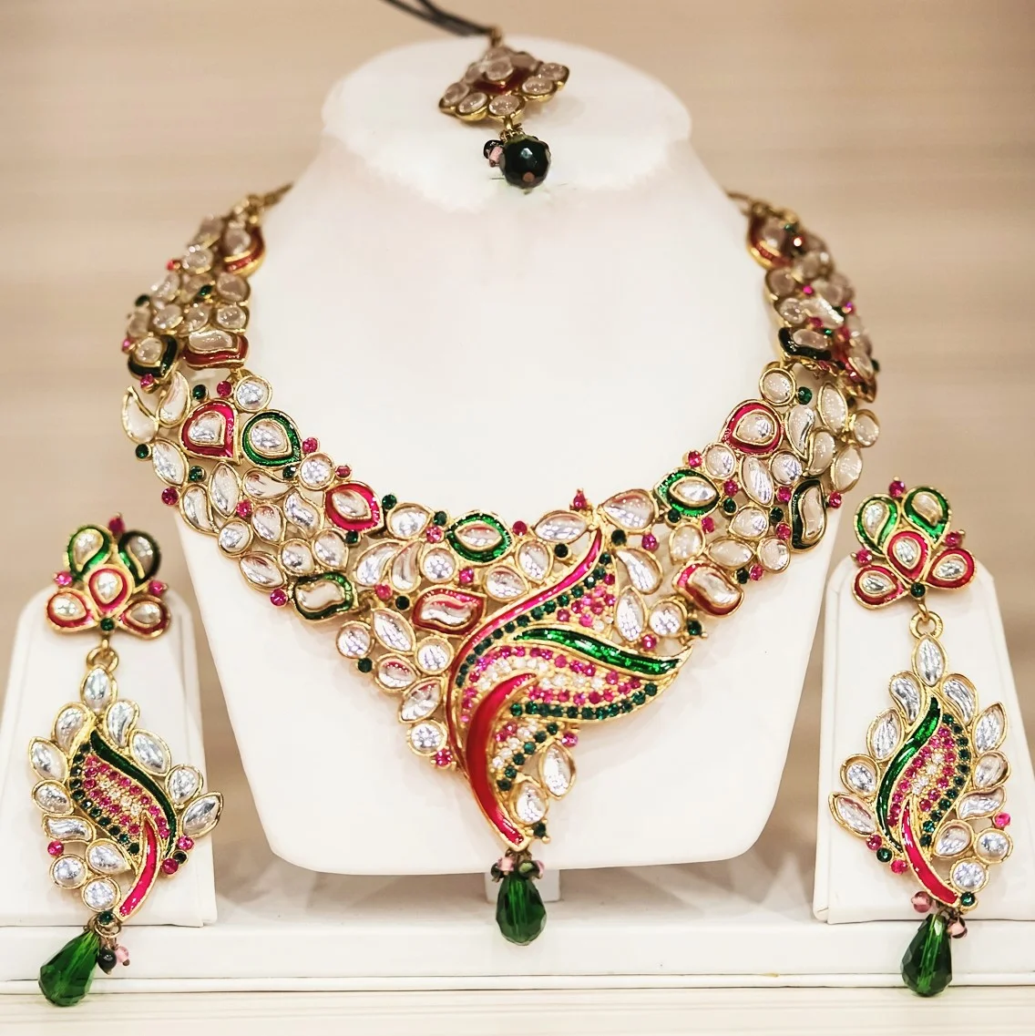 Spring Collection 2015 - 'Dancing Peacock' Pink and Green with Polki Diamond Necklace, Earrings and Headpiece Set