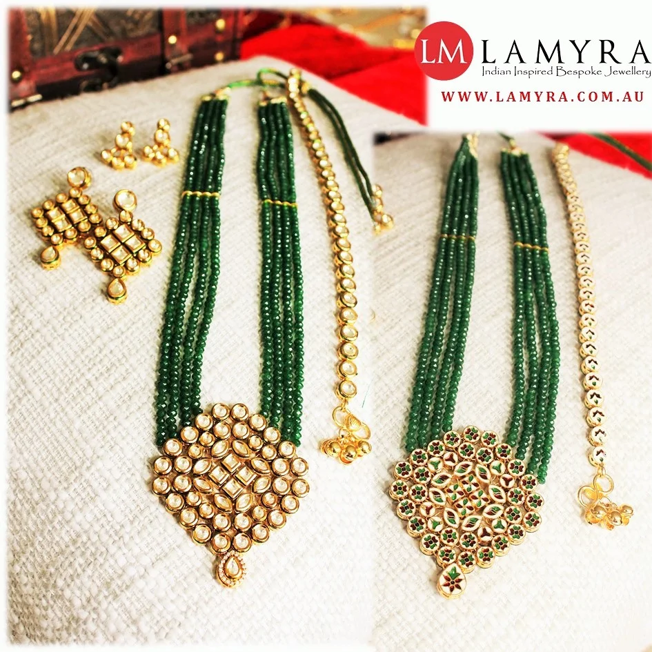 Presenting the LAMYRA Emerald Green Raani Haar (Queen's Necklace) Made with 4-strands of emerald green beads consolidated by a statement pendant crafted together with 36 circular polki diamond stones, 8 eyelet-shaped polki diamond stones, 4 square polki diamond stones finished by a single ambi-shaped polki diamond framed by crystals to achieve that balance and harmony that emerald green denotes.