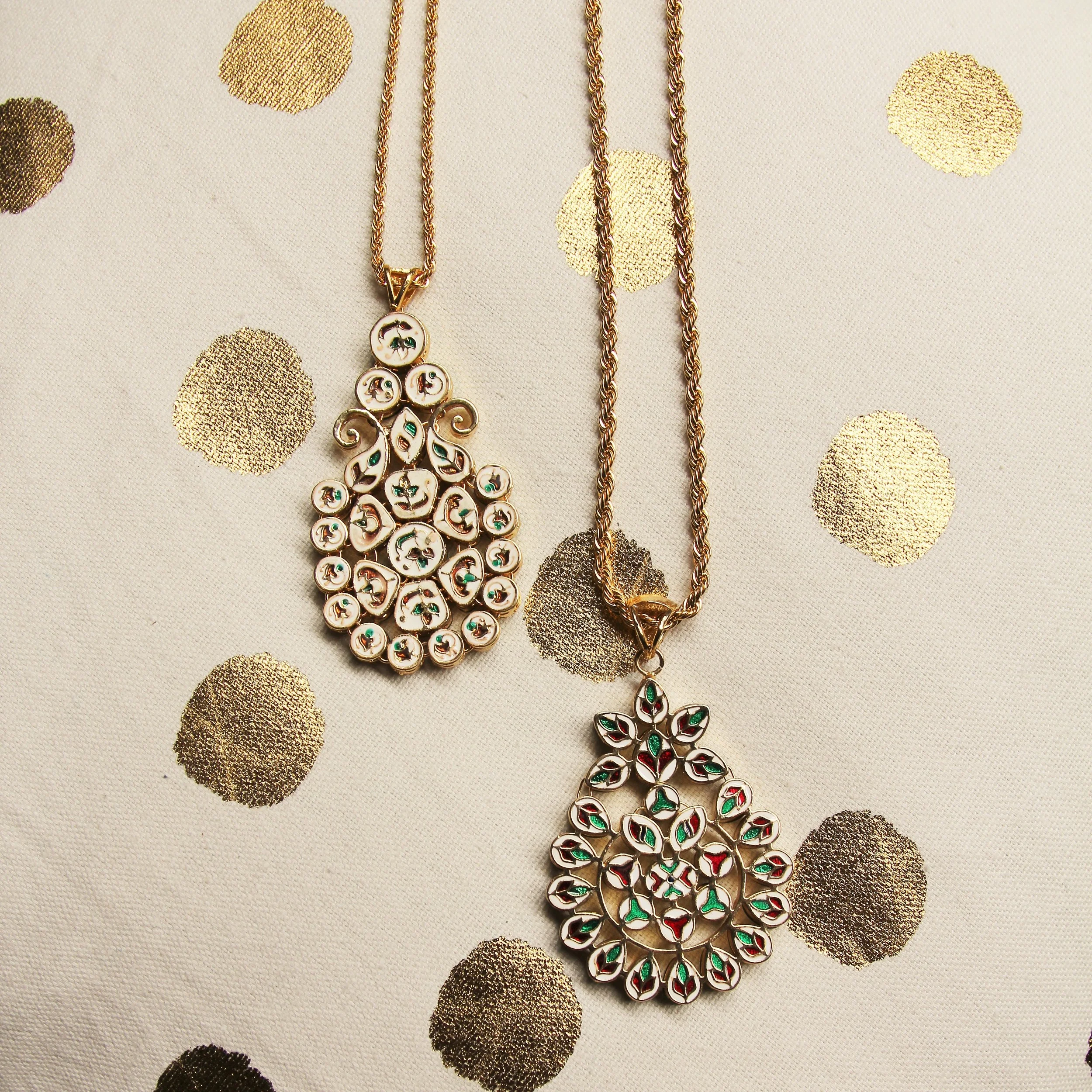 But wait, that's not all. Turn it over. Be mesmerised by the detailed, intricate Meenakari enamel work on the other side, in red and green on white - the perfect balance to the green beaded strands.